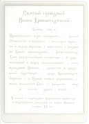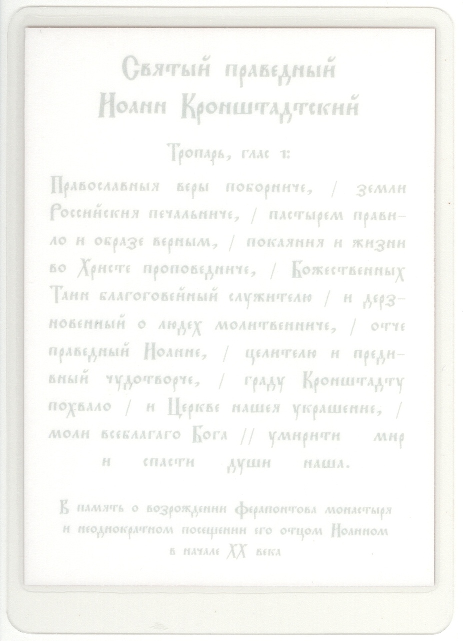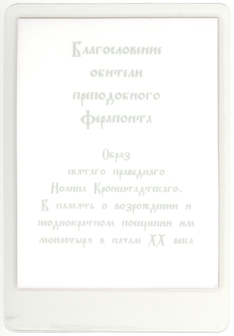 Святой праведный Иоанн Кронштадтский - духовник игумении Таисии (Солоповой). Обетный образ создан в память о возрождении Ферапонтова монастыря и неоднократном посещении о. Иоанном монастыря в начале XX века.