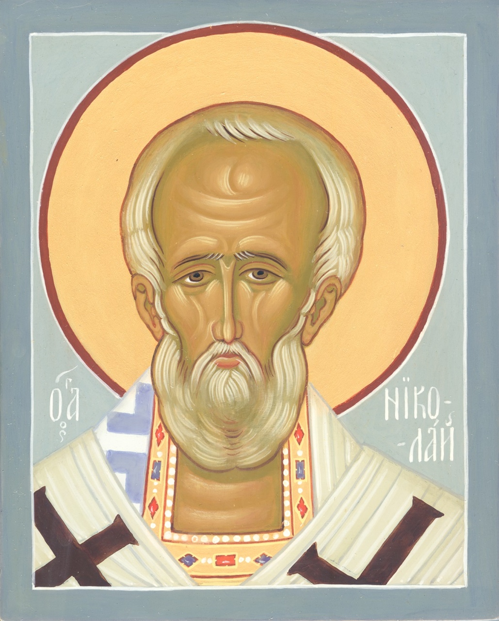 Аналойная икона свт. Николая, повторяющая лик святителя Дионисиева письма, написана иконописцем-реставратором высшей категории Соколовой Верой Фёдоровной в ферапонтовской иконописной мастерской в 2018 году.