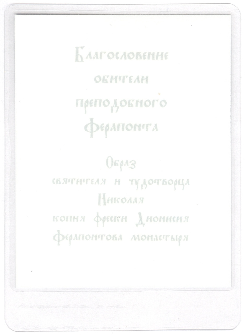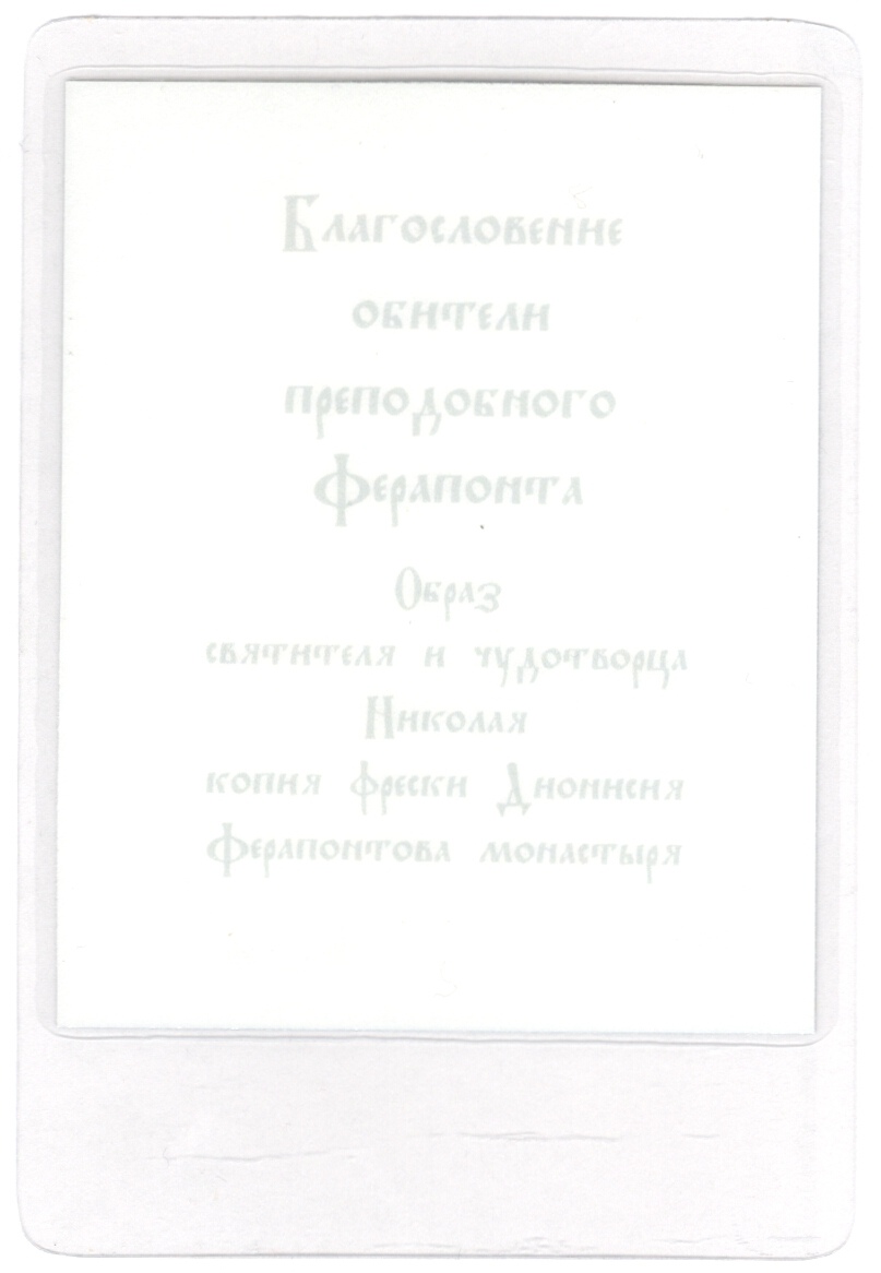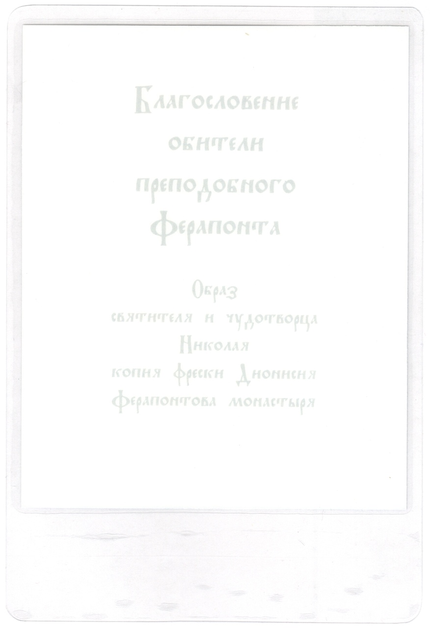Святитель и чудотворец Николай Мирликийский - особо почитаемый святой в Ферапонтовом монастыре. В главном соборном храме Рождества Богородицы находится придел, посвященный святителю Николаю. Все росписи собора выполнены иконописцем Дионисием.