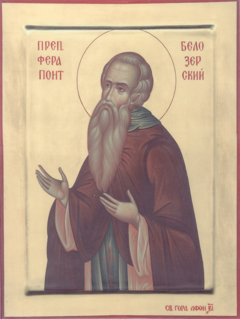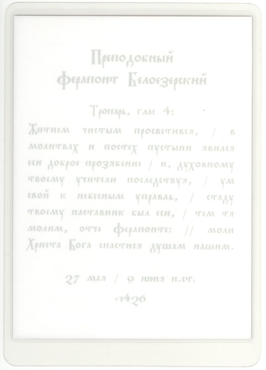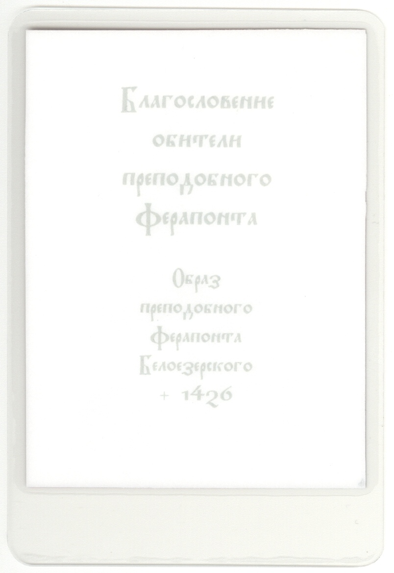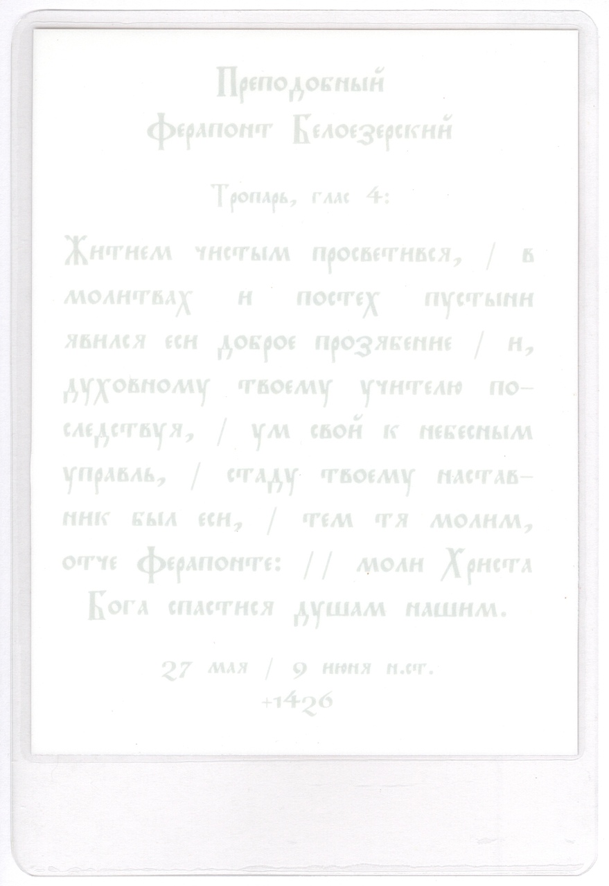 Аналойная икона прп. Ферапонта афонского письма. Написана по заказу греческими монахами в скиту Белозерка (Буразери) на Святой Горе Афон и преподнесена в дар Ферапонтову монастырю в 2012 году.