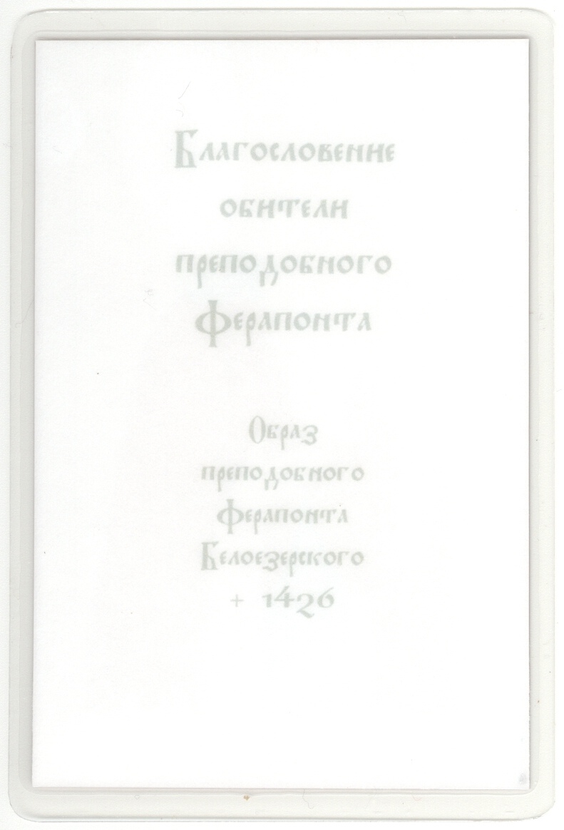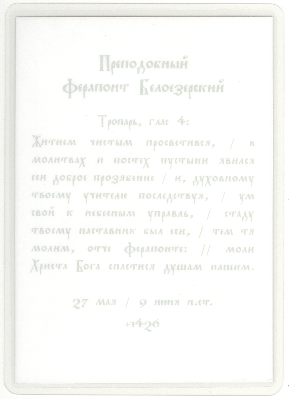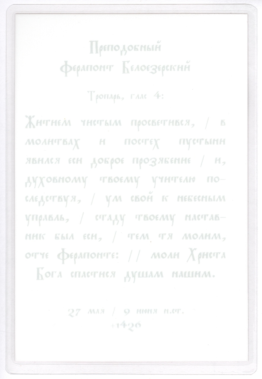 Аналойная икона прп. Ферапонта написана к торжественному празднованию преподобному Ферапонту в Лужецком Можайском Ферапонтовом монастыре в 2010 году и освящена на мощах угодника Божия.