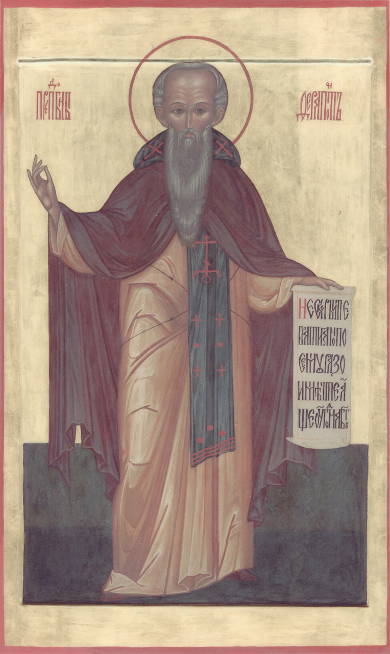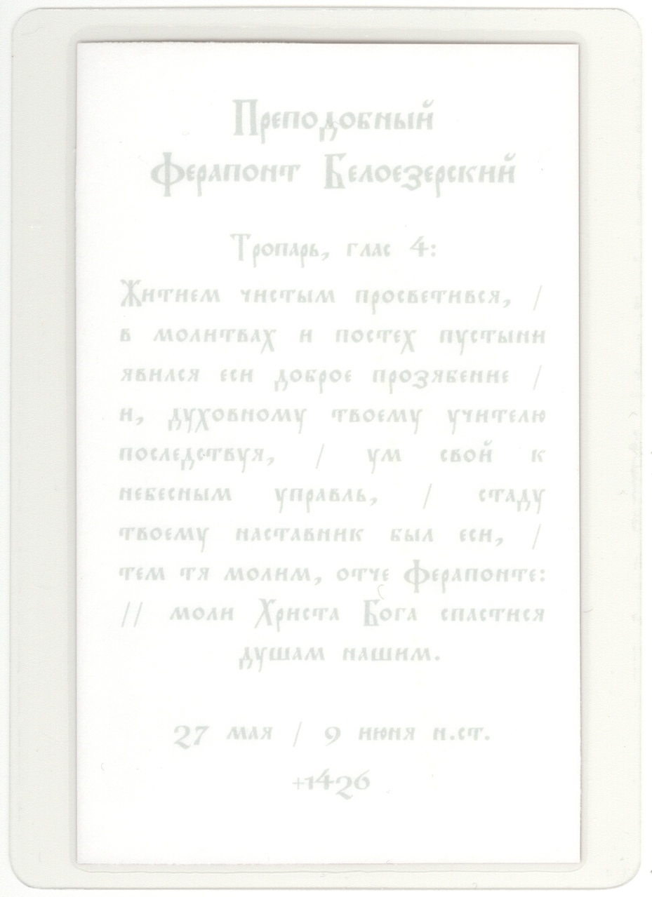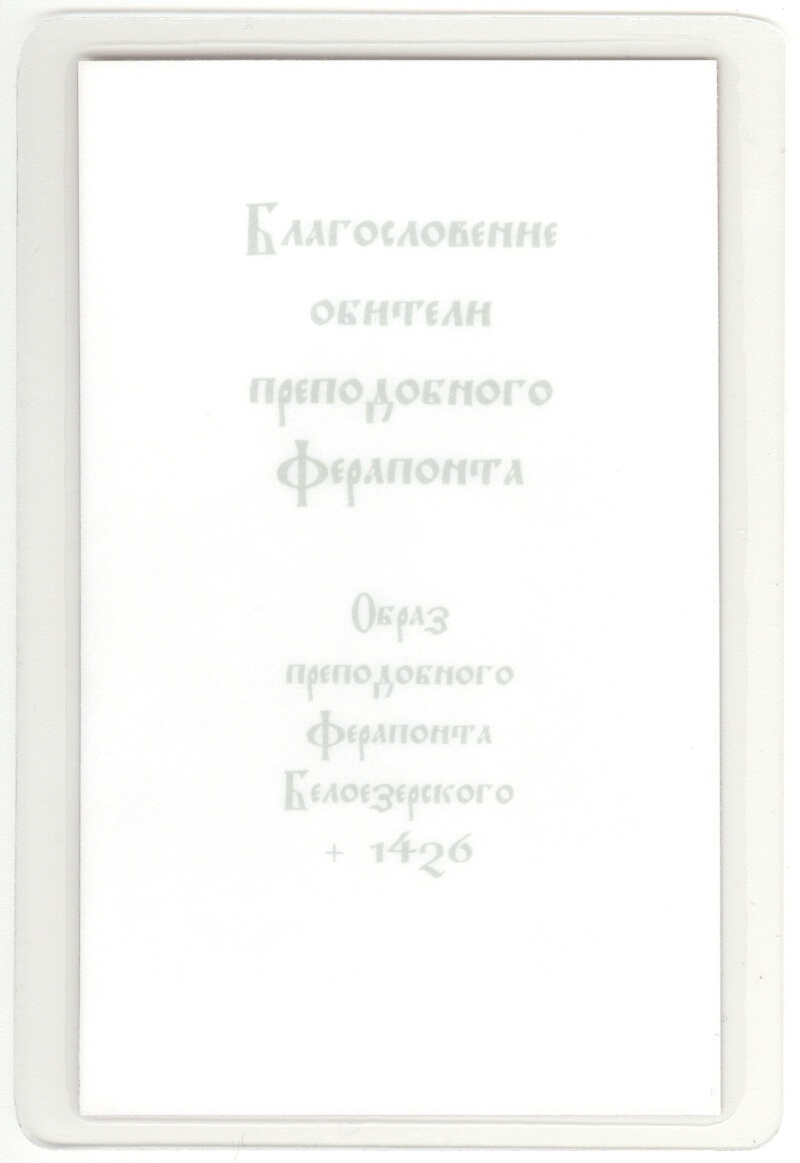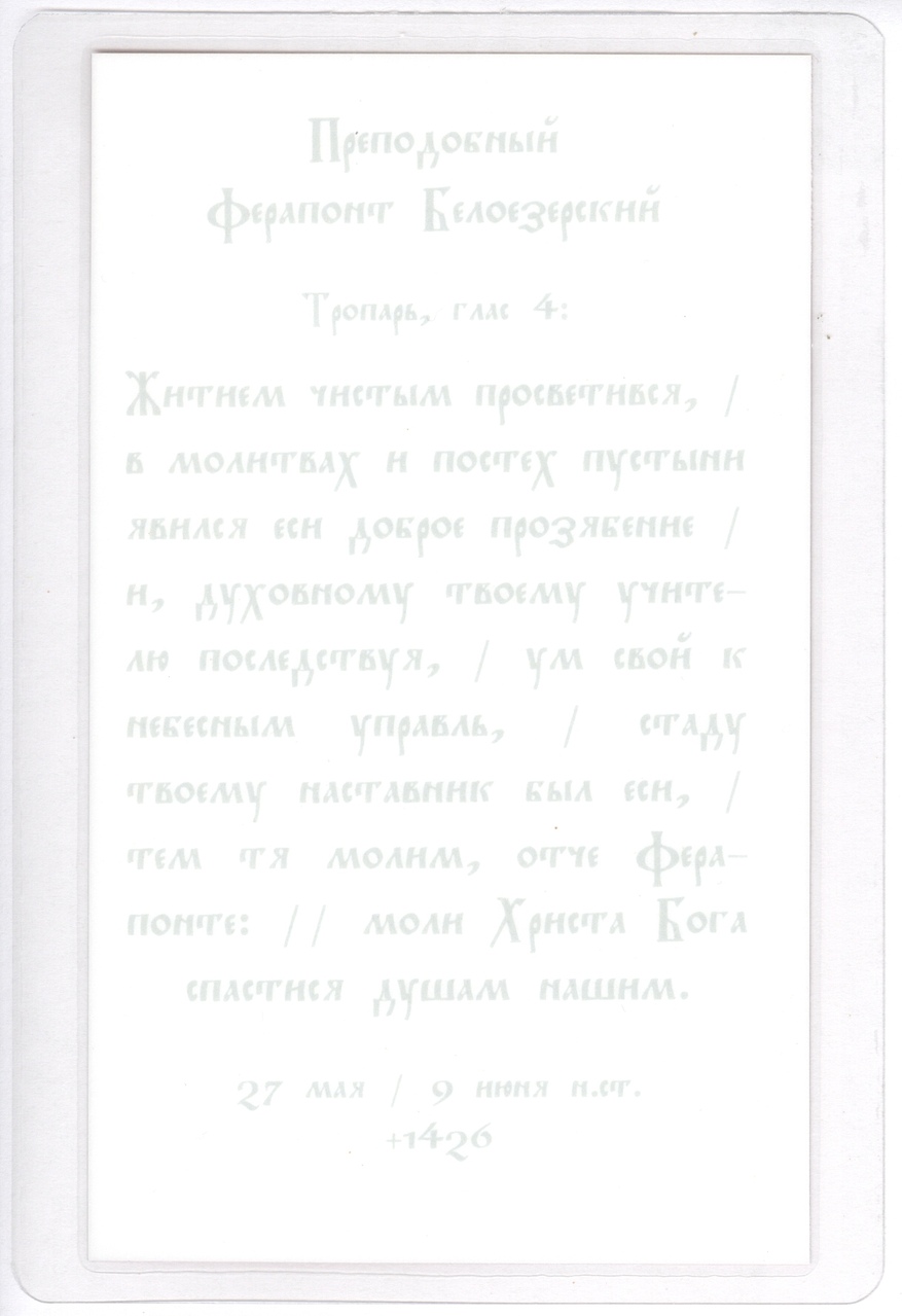 Список с храмового образа прп. Ферапонта XVII в. из надвратных церквей Ферапонтова монастыря. Написана на золоте в Центральной художественно-реставрационной мастерской им. И.Э. Грабаря Евгенией Тарасовой и Мариной Наумовой в 1998 году.