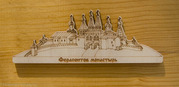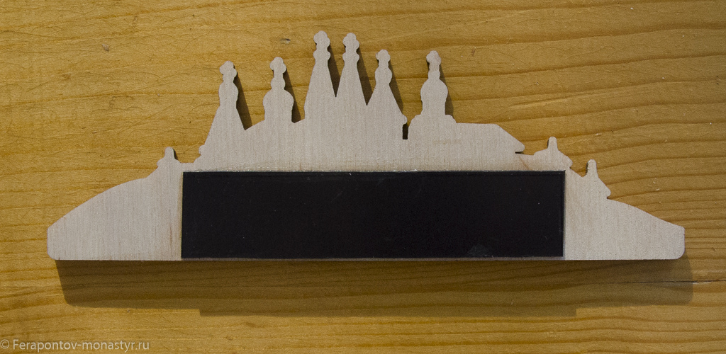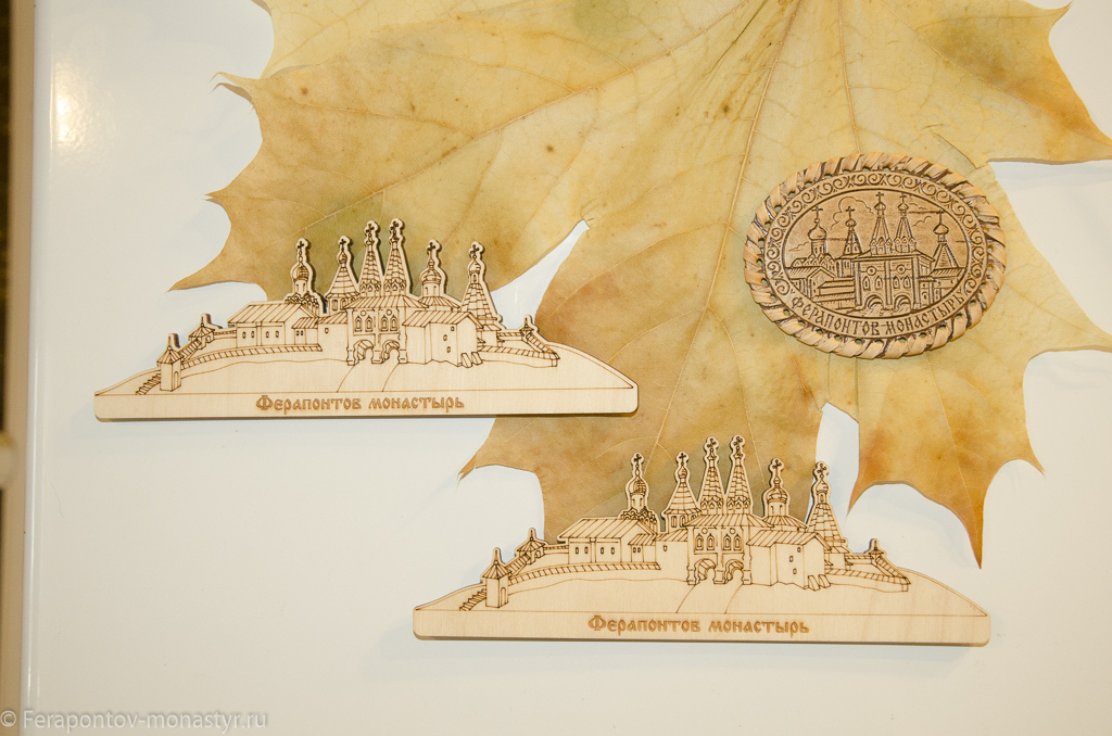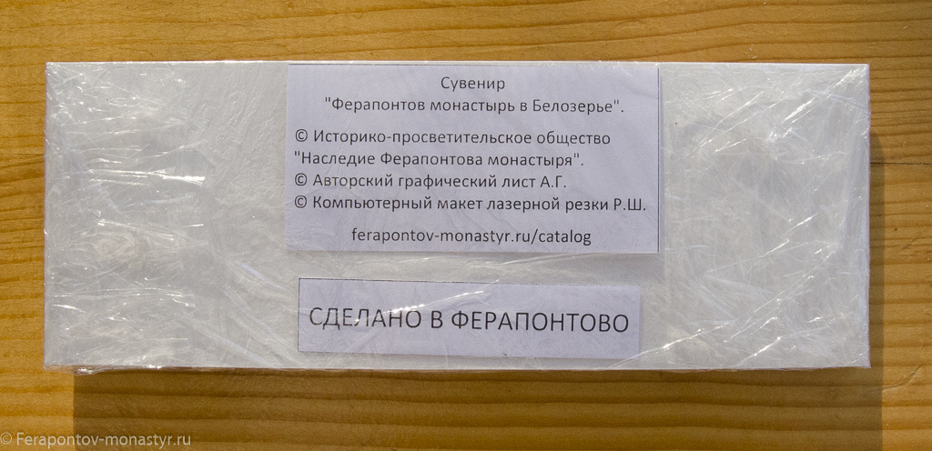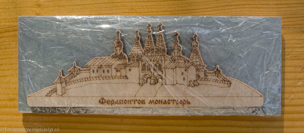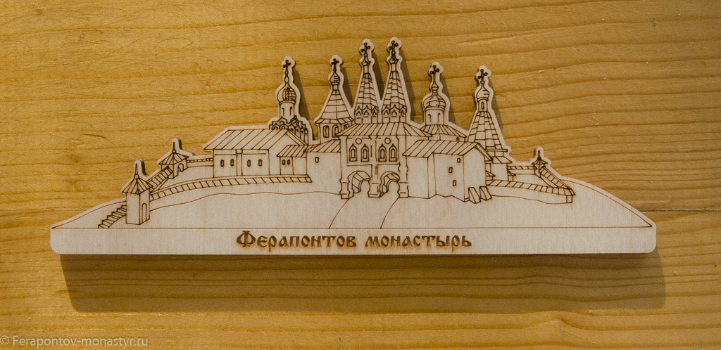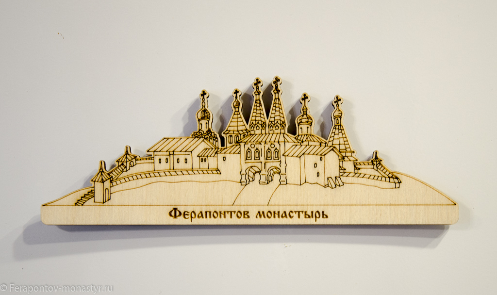 Макет-магнит Ферапонтова монастыря изготовлен методом лазерной резки. Материал: фанера, сорт 2/2, толщина 3 мм. Размеры модели: длина основания 152 мм., общая высота 54 мм. Упакован в стетч-плёнку или подарочную упаковку 165*70 см.