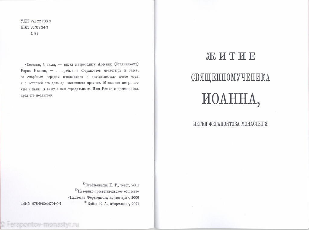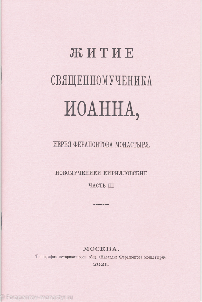 Книга: «Житие священномученика Иоанна, иерея Ферапонтова монастыря». Новомученики Кирилловские, часть III.