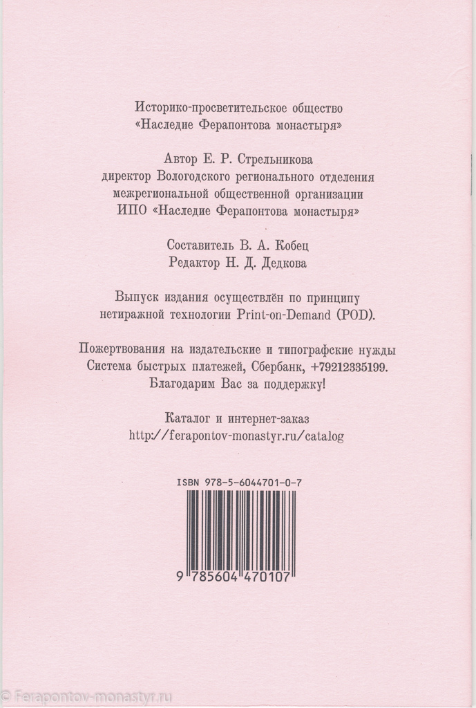Автор: Е. Р. Стрельникова, директор Вологодского регионального отделения межрегиональной общественной организации «Историко-просветительское общество «Наследие Ферапонтова монастыря».